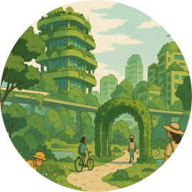 In 2050, cities and nature thrive together. Buildings breathe with plants, energy comes from sun and wind, and people live in harmony with ecosystems. Urban life is slow, green, and shared—with food grown in vertical gardens and mobility designed for walking, cycling, and animal life alike.
