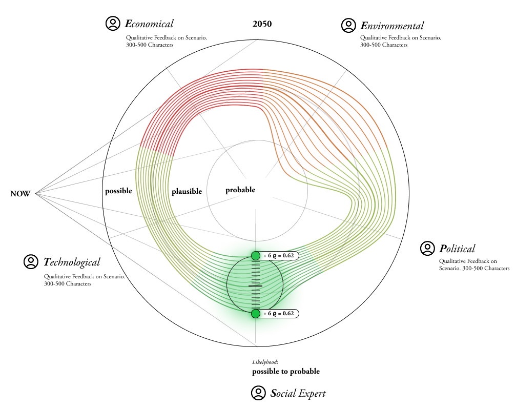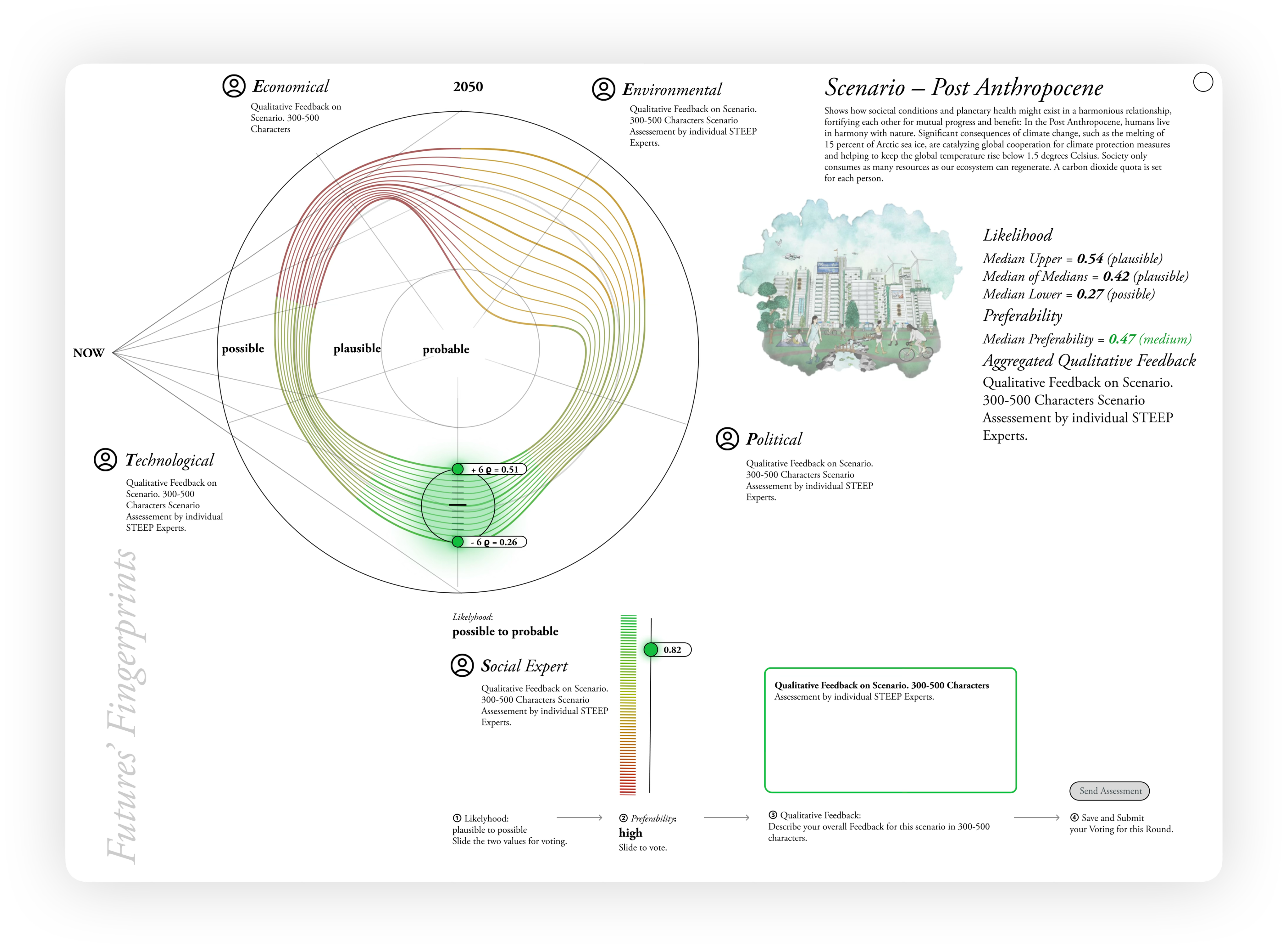 Futures’ Fingerprints turns abstract foresight into graspable, shared experiences. At its core is an interactive “digital round table” where participants co-create scenario assessments using intuitive visual tools. These fingerprints make divergent expert views visible and negotiable — enabling rich group dialogue, faster convergence, and deeper reflection. This design promotes not just understanding the future, but shaping it together.