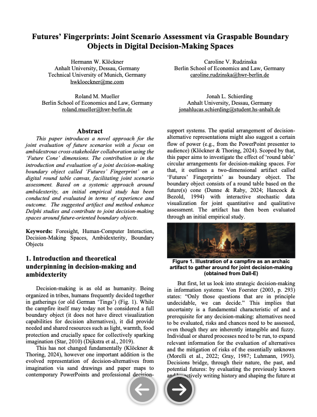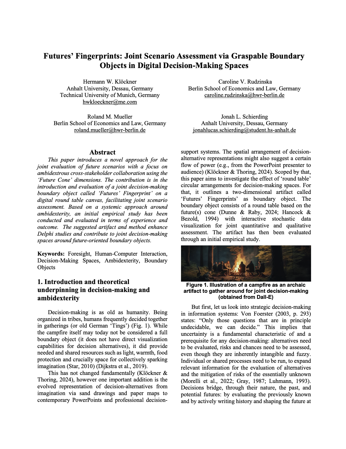 Futures’ Fingerprints has been evaluated in a 2024 study with key experts from politics, economy, ecology and social backgrounds and a 2025 study at the Berlin University of Economics and Law, International Strategic Management.It has been peer reviewed and published on HICSS 2025 conference (Hawaiian International Conference of Systems Science) and authored by Prof. Hermann W. Klöckner, Prof. Dr. Caroline Rudzinska, Prof. Dr. Roland M. Mueller and Jonah L. Schierding.